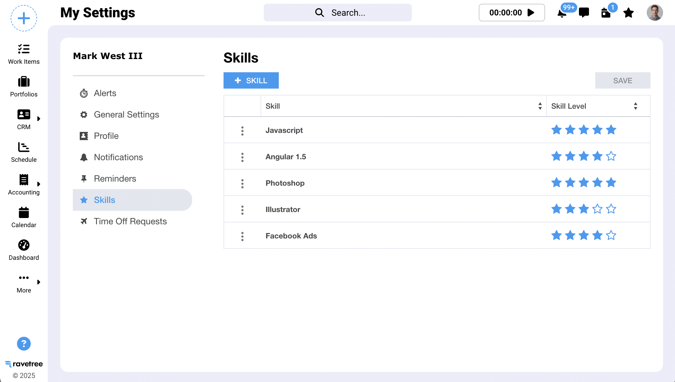 To add a skill click on your user icon in the upper right corner and select "Settings", then click on "Skills" on the left side of the page. Click on the "+ Skill" button to link a new skill to your member profile (as shown below). Make sure to select the star rating for each skill that you feel is appropriate for your level of proficiency in that particular skill. NOTE: the skill selector dropdown menu (shown as "Photoshop" in the screenshot below) allows you to select from pre-defined skills that have already been created. This list of skills can be created on the Admin/Skills page by anyone who has access to your Ravetree Admin page.
