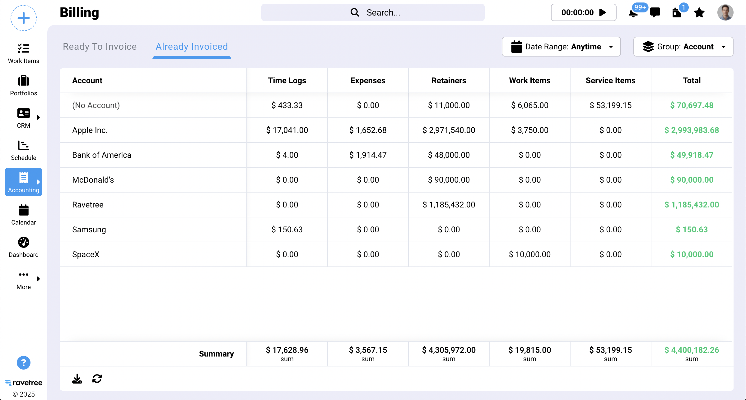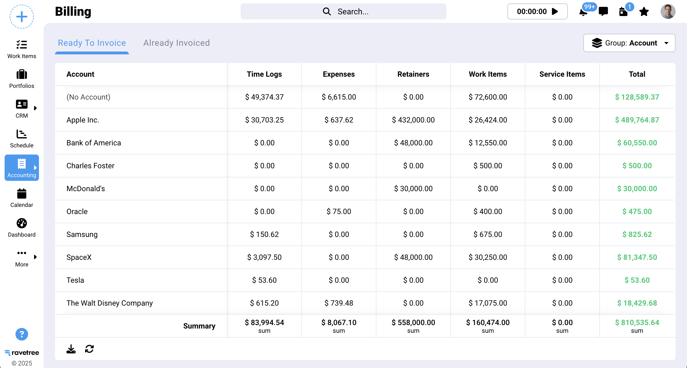 The Billing page in Ravetree makes it easy to see what is ready to be invoiced and what has already been invoiced. To access the Billing page, simply click on the Accounting tab on the left sidebar and select "Billing".