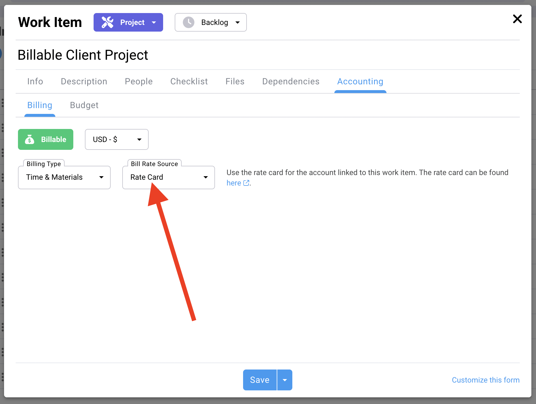 It is, however, possible to bypass the use of a rate card for time logged against a work item. To ensure that a rate card is used, make sure you select "Rate Card" as the Bill Rate Source on the work item:
