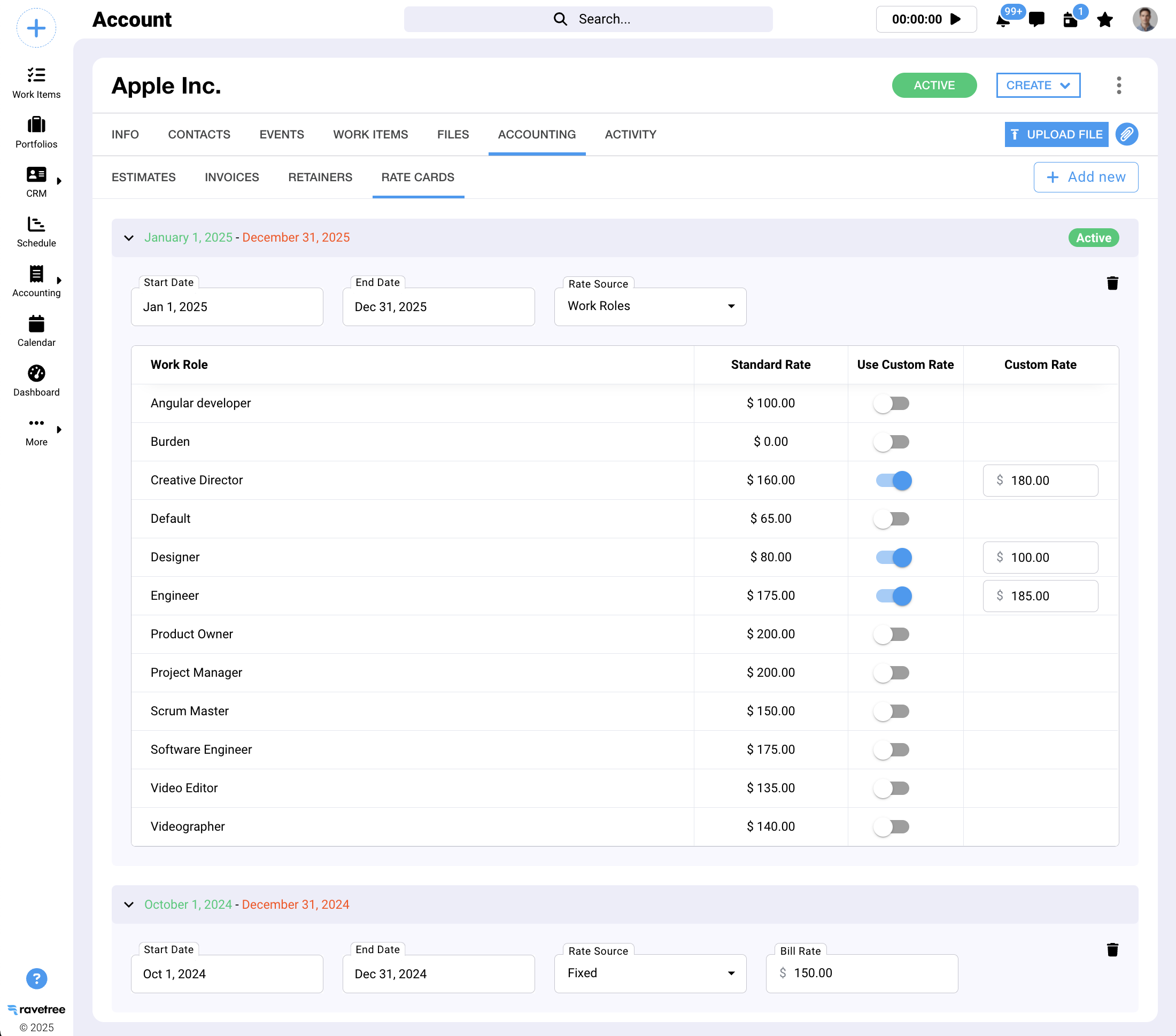 Rate cards can be used when you have special bill rates for different clients. To set up a rate card simply go to the account page for one of your clients and click on the Accounting tab, then select the Rate Cards tab.