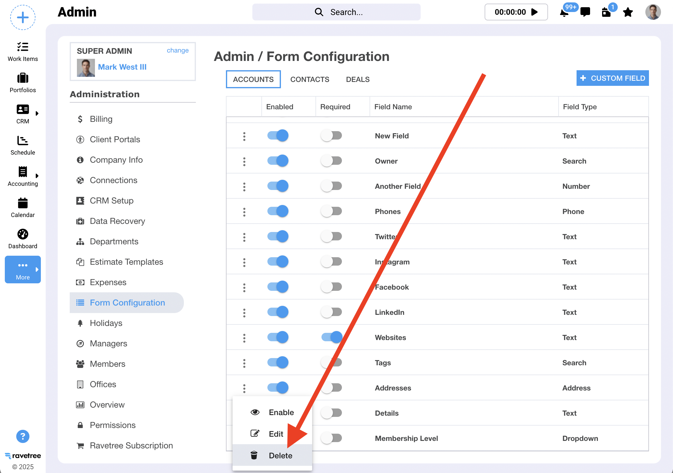 To delete a custom field that has been added to either an Account, Contact, or Deal, simply navigate to the Admin/Form Configuration page. Then, make sure you select the tab for the item you want to remove the custom field from (i.e., Account, Contact, or Deal). Then, click on the 3 dots menu next to the custom field you want to delete. Finally, click on "Delete" in the options menu.