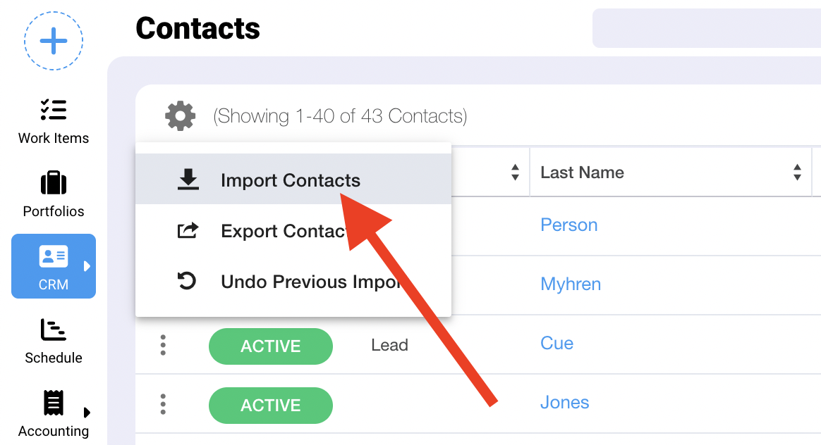 You can import contacts via a CSV file. Go to the Contacts page and click on the 3 dots menu in the leftmost column header to access the importer, as shown below: