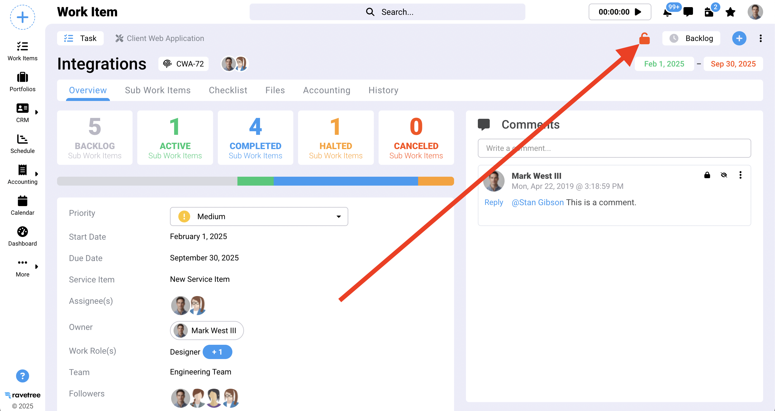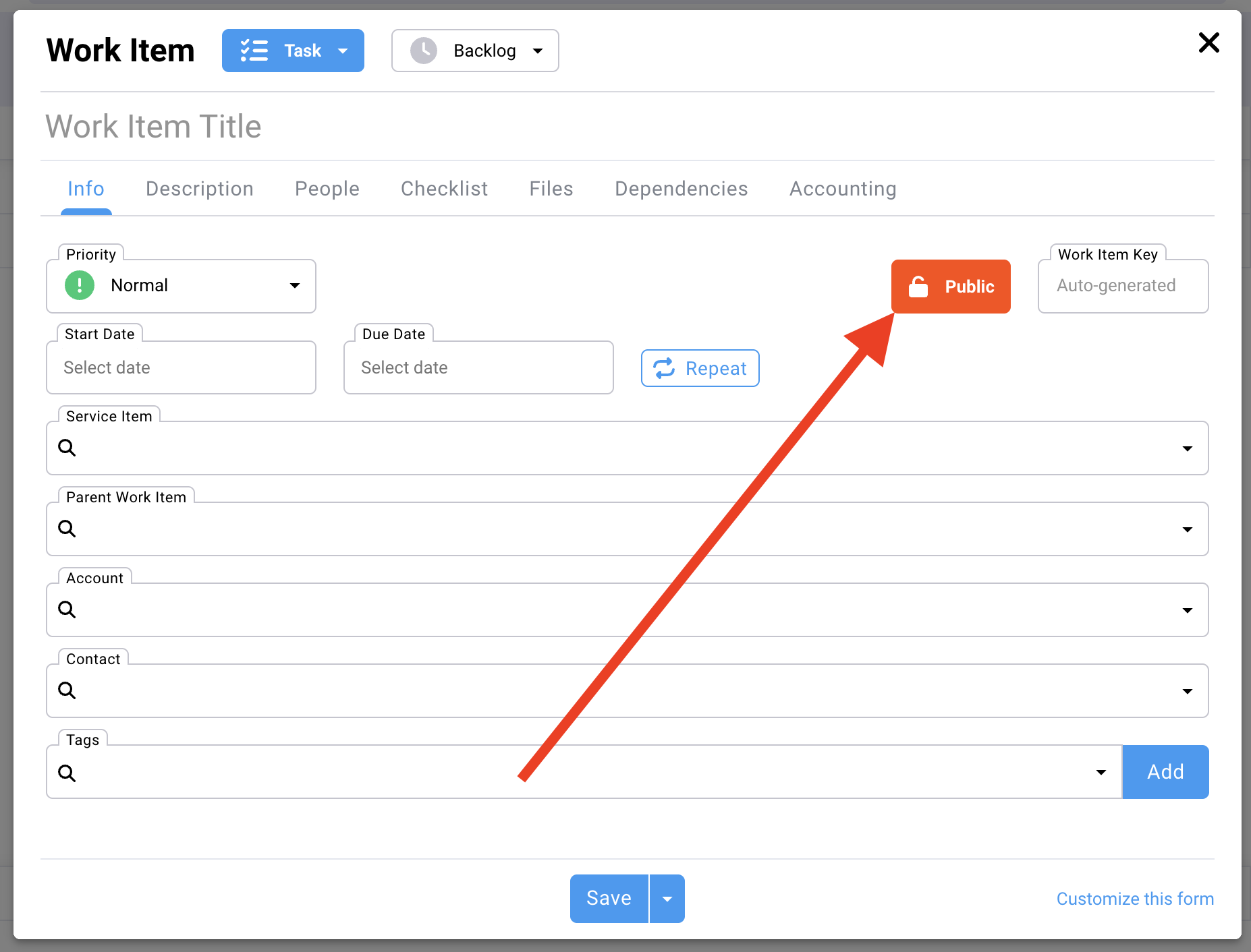 You can click on the button shown above to toggle between Public and Private. The privacy status of a work item is inherited by its children. That is, if you create nested work items, then they will inherit the privacy status of their parent. You can easily see the privacy status of a work item when on the work item page, as shown below: