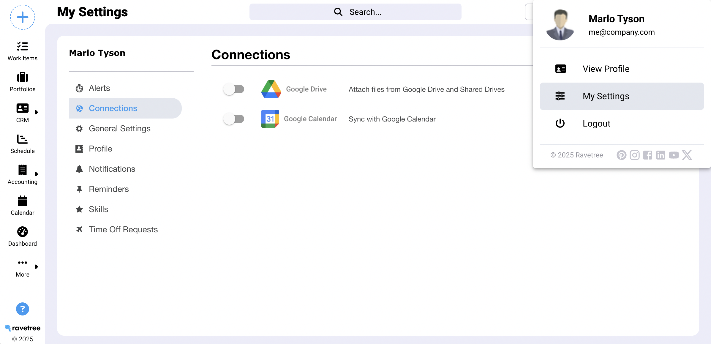To enable the Google Calendar integration go to your "My Settings" page and click on the "Connections" section on the left. Then, click on the switch next to the Google Calendar logo. NOTE: If you don't see the Google Calendar option on your Connections page, then it means your Ravetree admin hasn't enabled it for your company. They can enable it by following the instructions here.