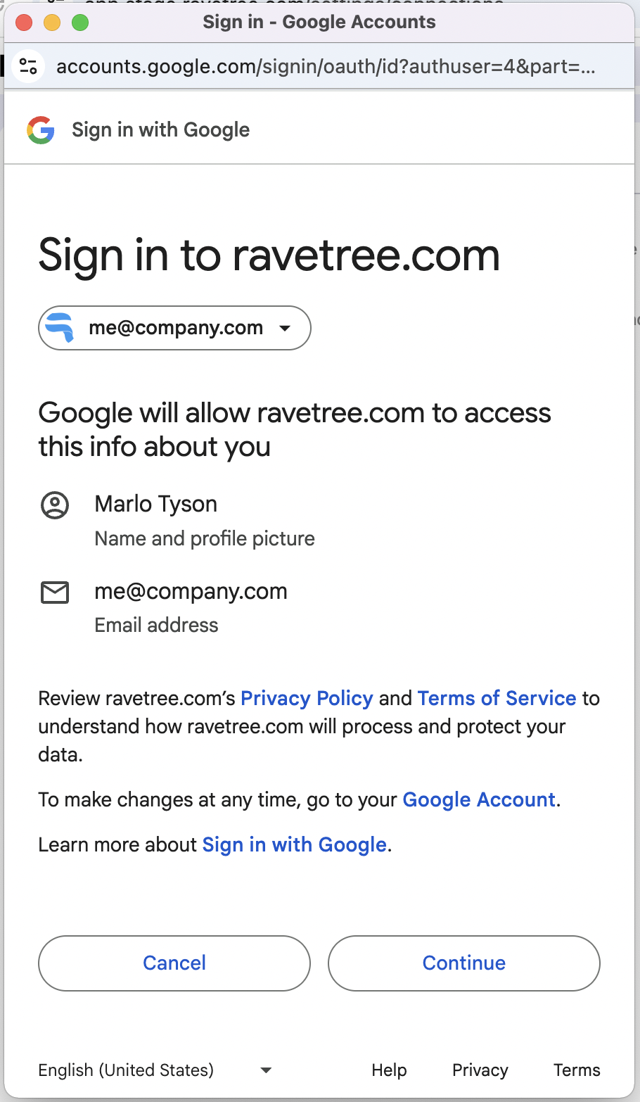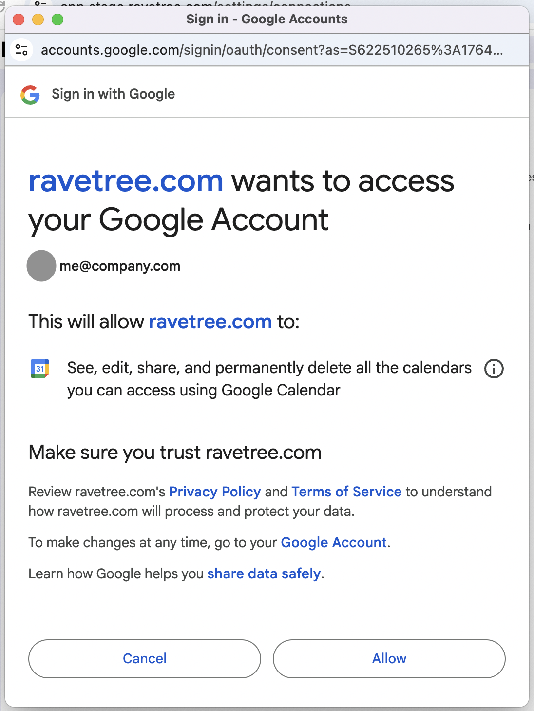 The integration allows for two-way syncing between events created on either calendar. That is, you can create events in Ravetree and they will show up on your Google Calendar. Likewise, events created on your Google Calendar will show up on your Ravetree calendar. Updates made to events on either calendar will propagate to the other calendar.