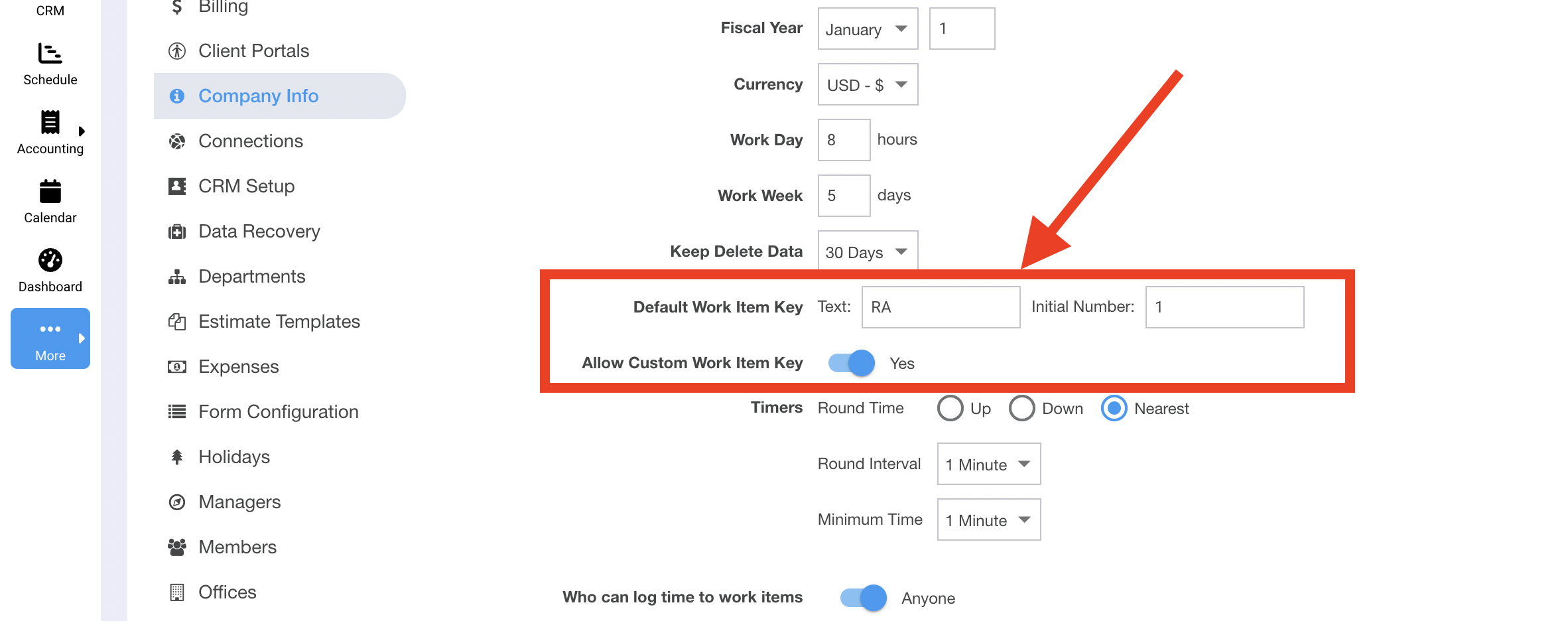Top-level work items can have their keys auto-generated, or you can enter a key when creating a work item. Customization options can be found in on the Amin/Company Info page in Ravetree.