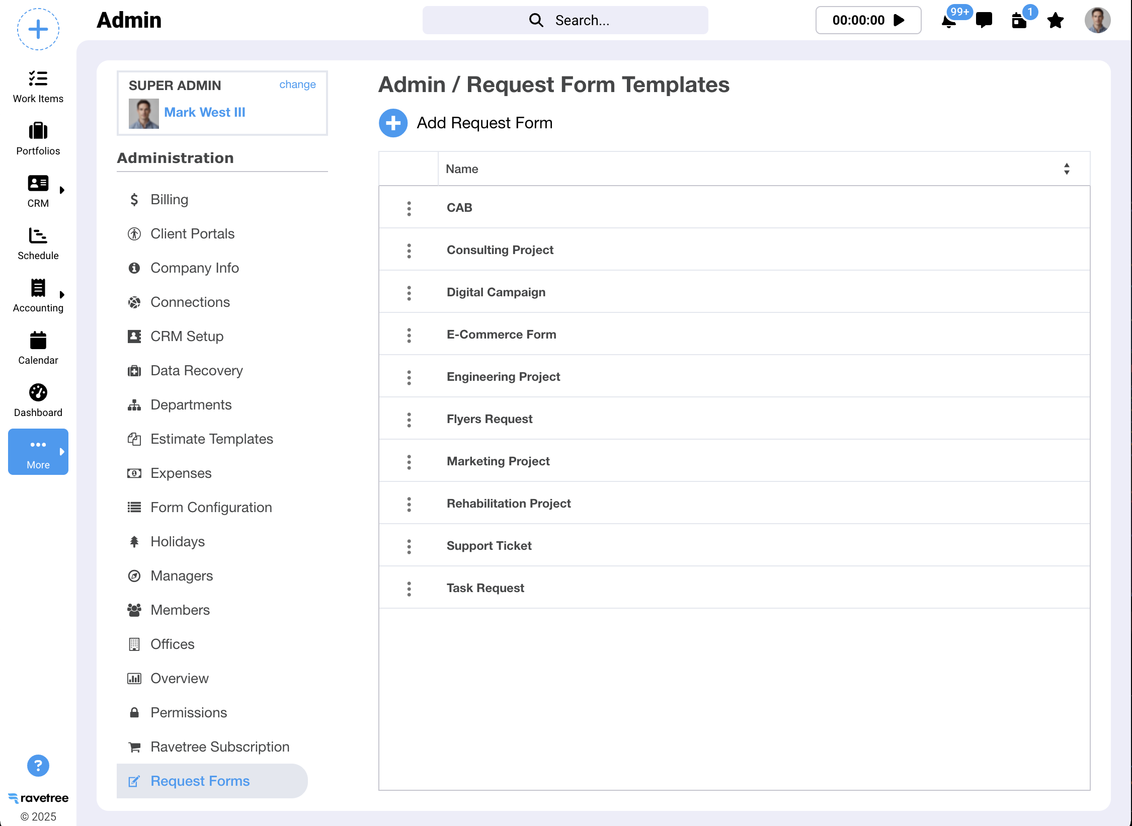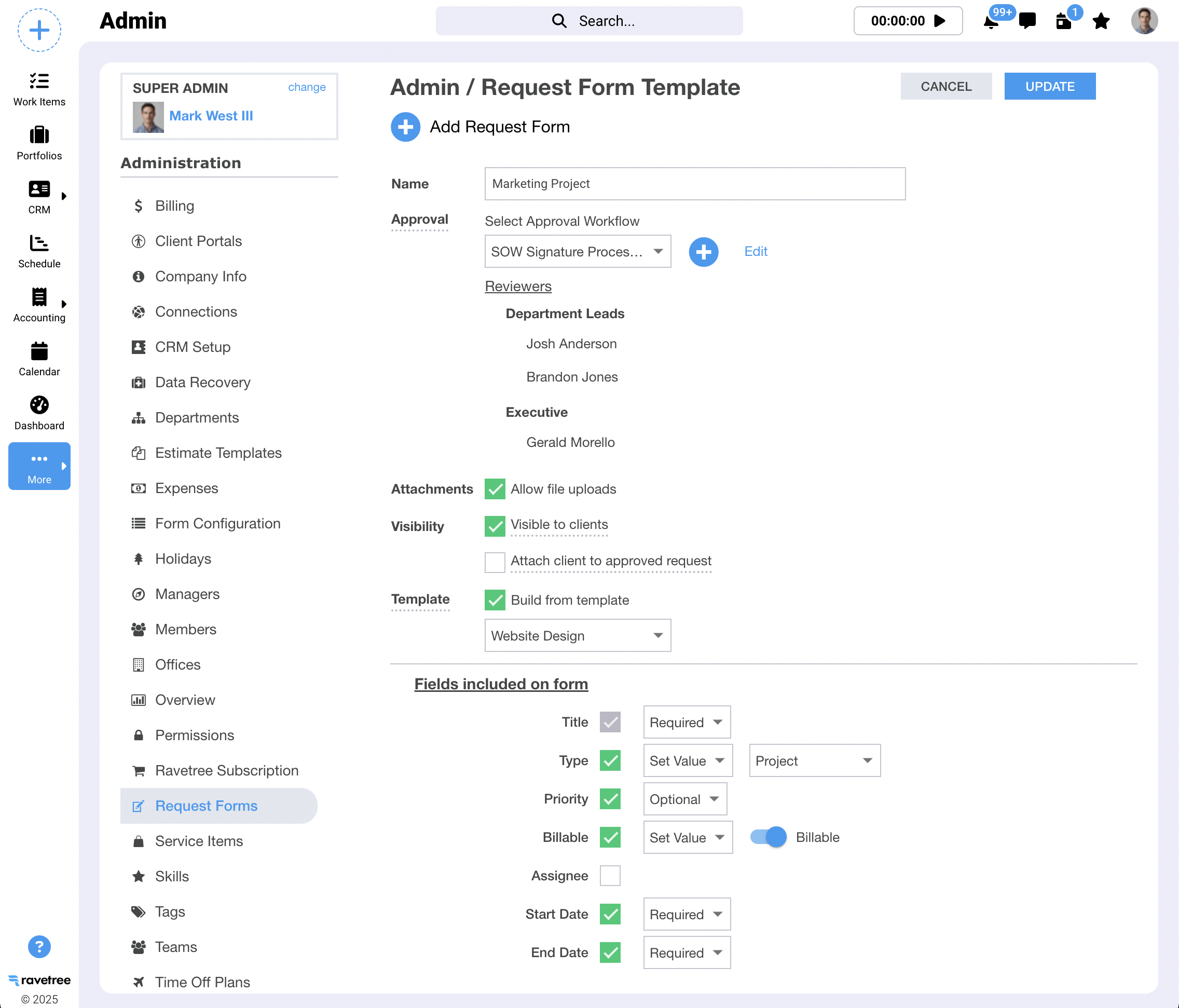 You may have request forms that you don't want your clients to see (via the client portal). In that's that case, then don't select this option. Any request forms that are not visible to clients will only be visible to people who are licensed members of your Ravetree account. The "Attach client to approved request" option will automatically link the client (i.e., Account) to the approved request.