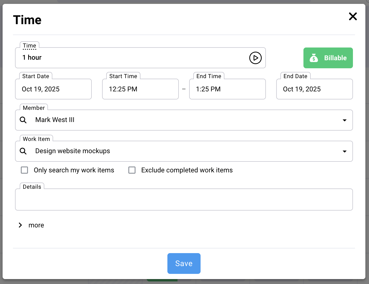 - Click the 3 dots dropdown menu next to a work item and select "Create Time Log"