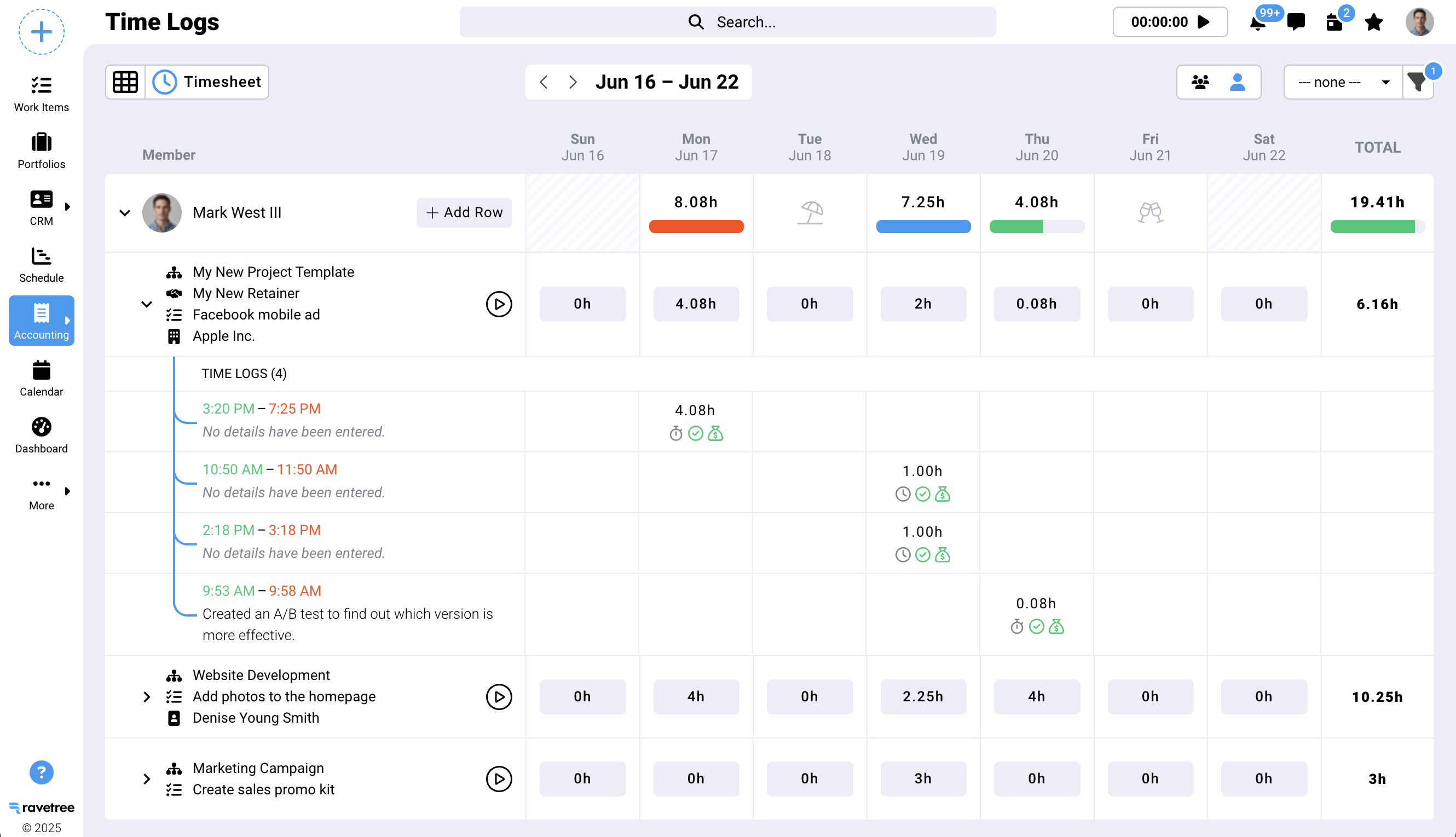 In the screenshot below you can see that Mark has entered four time logs against the first row "My New Retainer". All four of them are billable and approved, as indicated by the green icons. You can also see the start and end time for the time logs, and the details that were entered. Notice the umbrella icon on Tue, June 18. This lets us know that Mark is on vacation that day. The icon on Fri, June 21 tells us that it's a company holiday. The striped backgrounds on Sat and Sun tell us that it's not a work day. This may be different for other users. The read bar on June 17 indicates that Mark has exceeded his maximum work items for the day (which happens to be 7.25 hours). The blue bar on June 19 indicates that he has maximized his workday. This is, he logged time for the exact number of hours he is set to work on a given day (NOTE: workday hours can be set for each user on the Admin/Members page). Lastly, the green bar on June 20 indicates that Mark still has entered less time than his daily number of work hours. That is, he still has some time left.