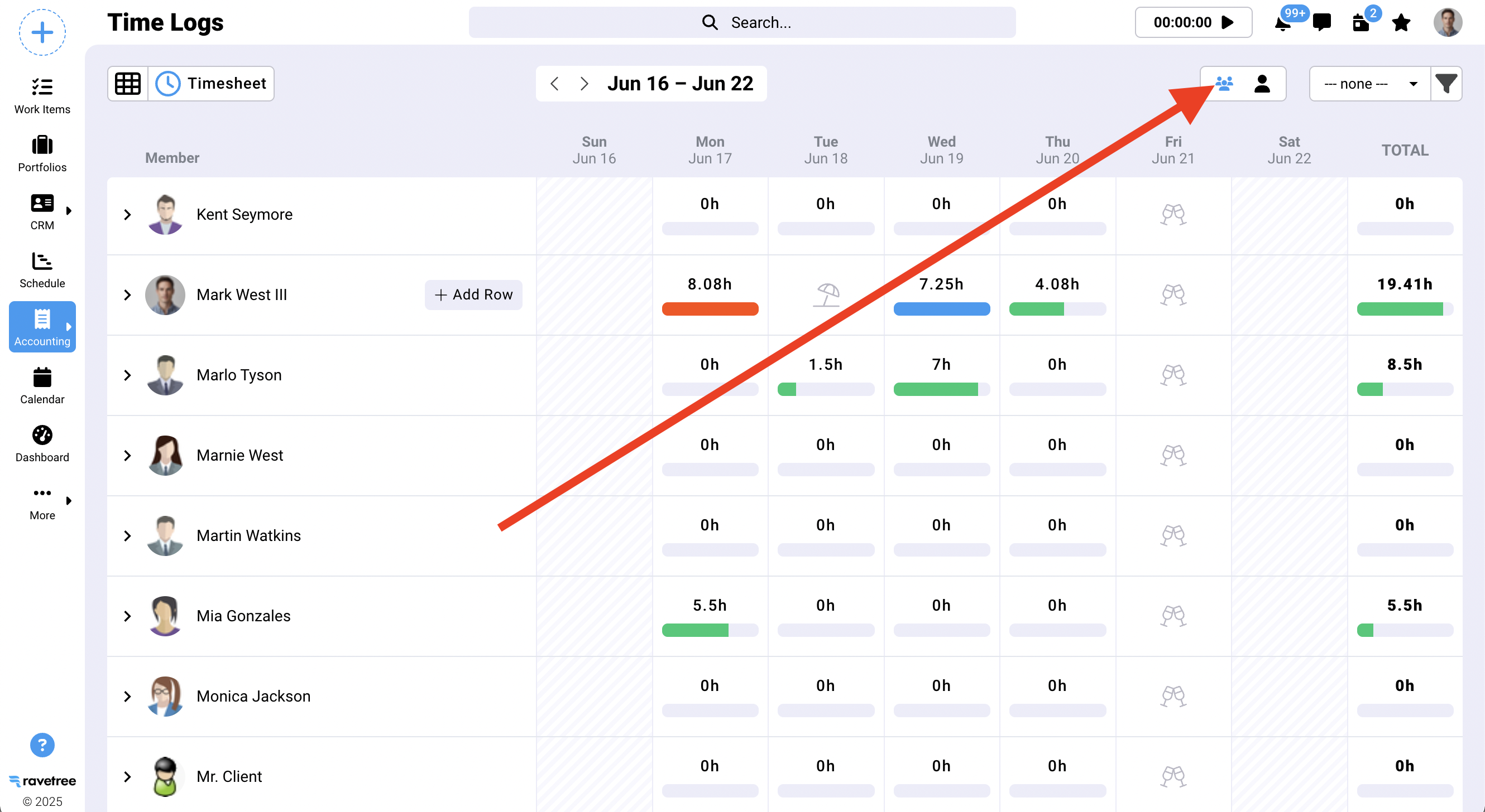 The company timesheet allows you to see the timesheets for everyone at once. To switch from your personal timesheet to the company timesheet click on the icon shown in the screenshot below. (If you don't see this option, then it means you have not been granted permission to see the company timesheet.)