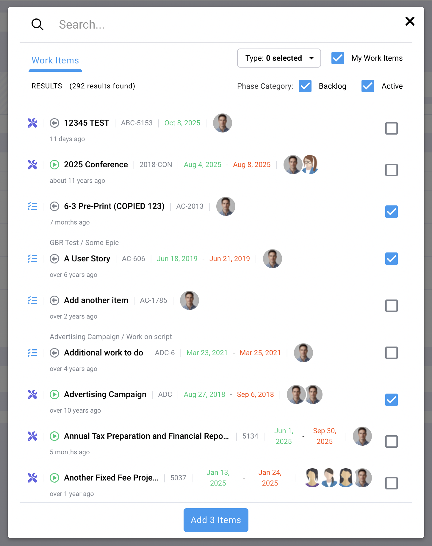 You can add a new row to your timesheet by clicking on the "+ Add Row" button next to your name. This will present you with an option to search for work items. By default, this list will only show work items assigned to you, but it can be changed if needed. You click on an item to add it, or you can check several items to add more than one: