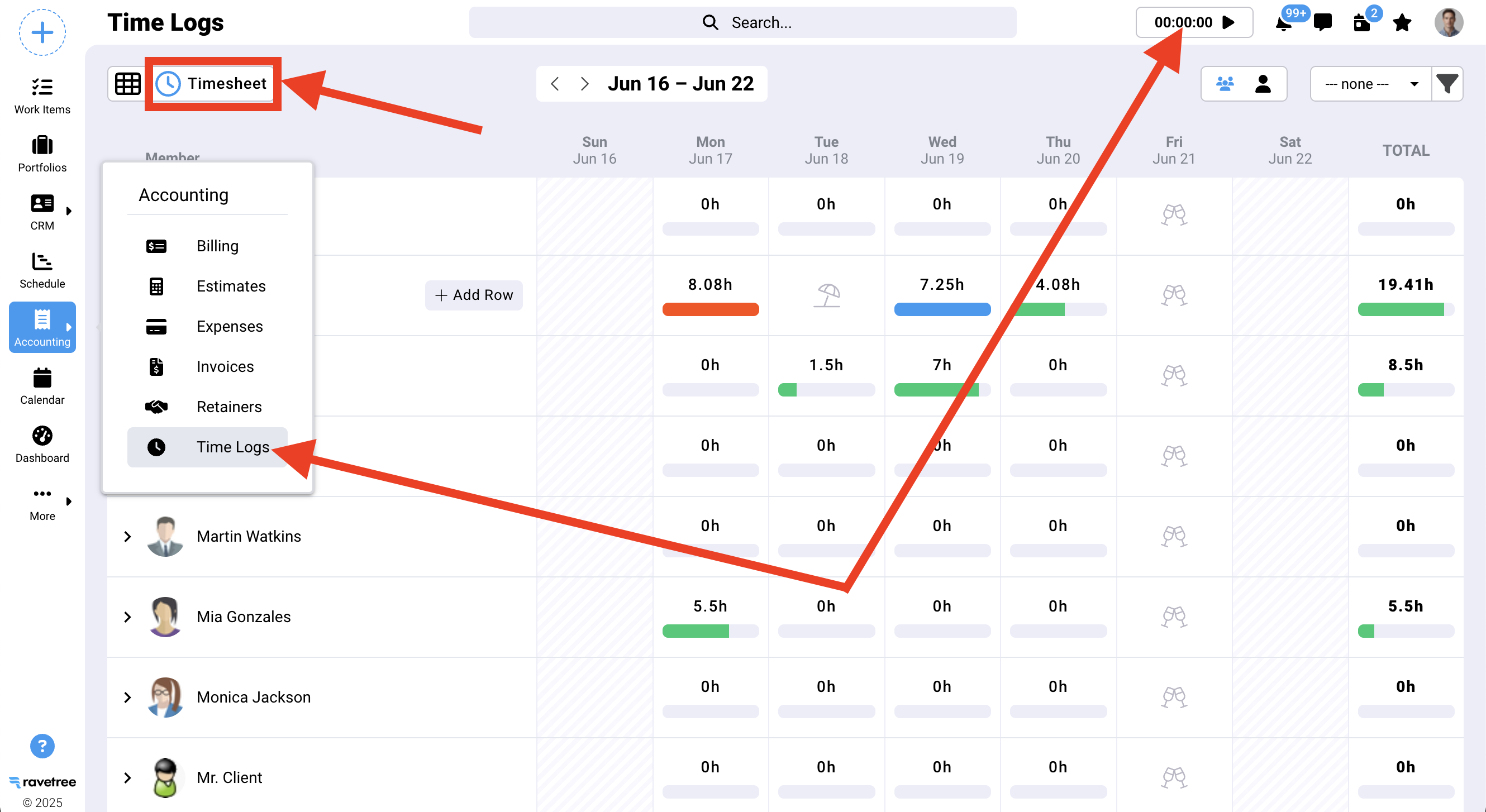 Timesheets are particularly useful for people that choose to enter their time at the end of the day or week. You can access the Timesheet from either the Accounting sidebar menu, or from the Timer in the header bar (don't click the "play" button though). Once you're on the Time Logs page make sure you have selected the Timesheet view, as opposed to the table view: