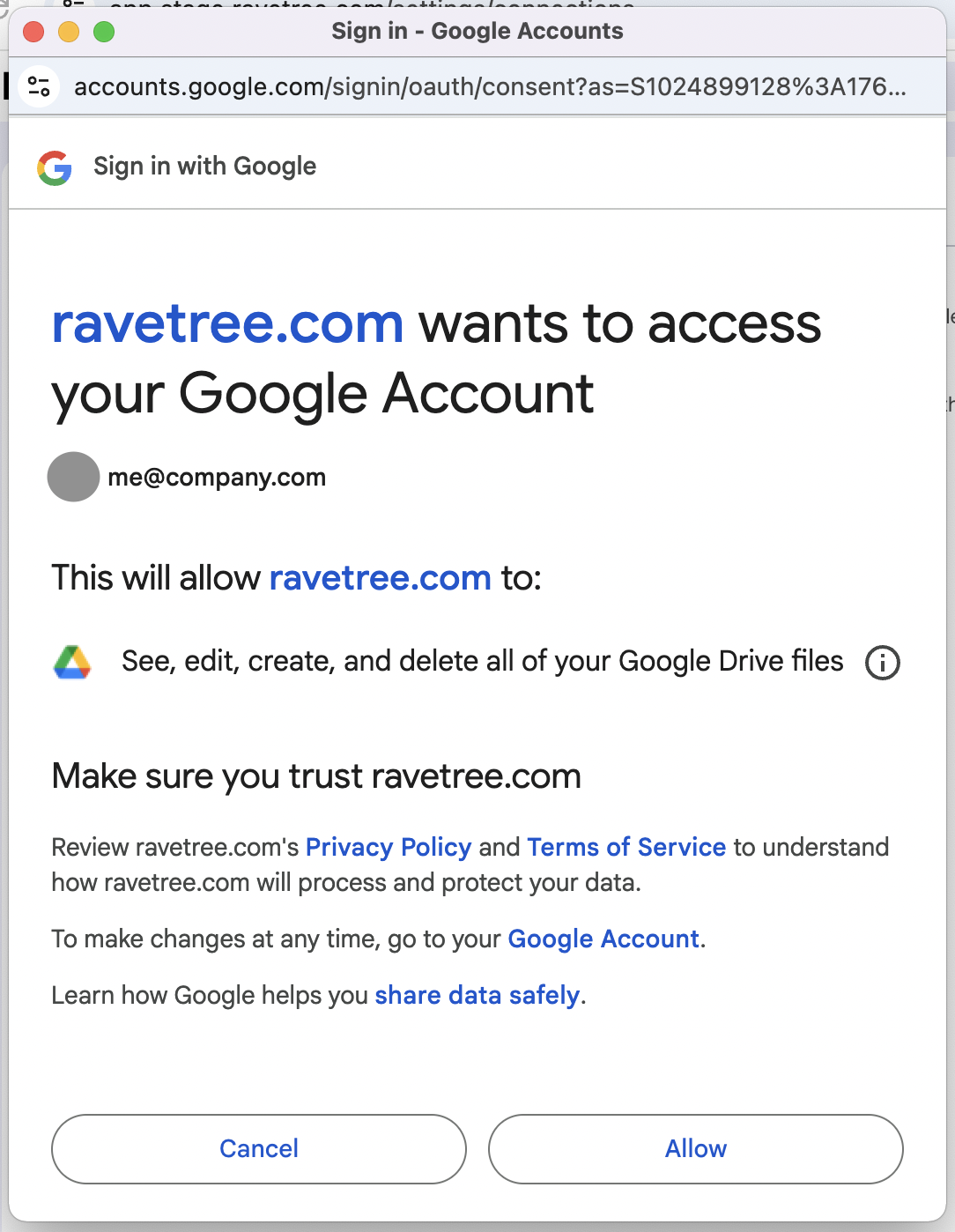 After enabling the integration you will need to follow a series of popup modals that request access to your Google Drive information: