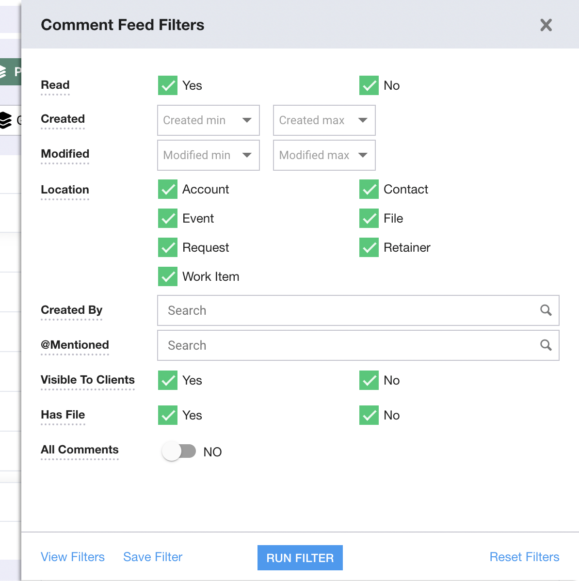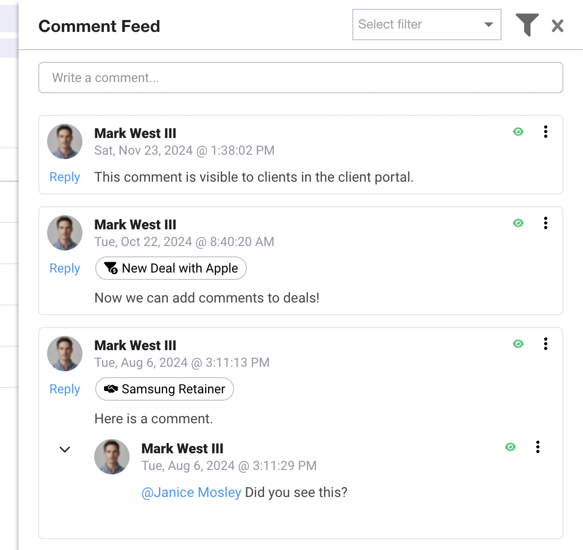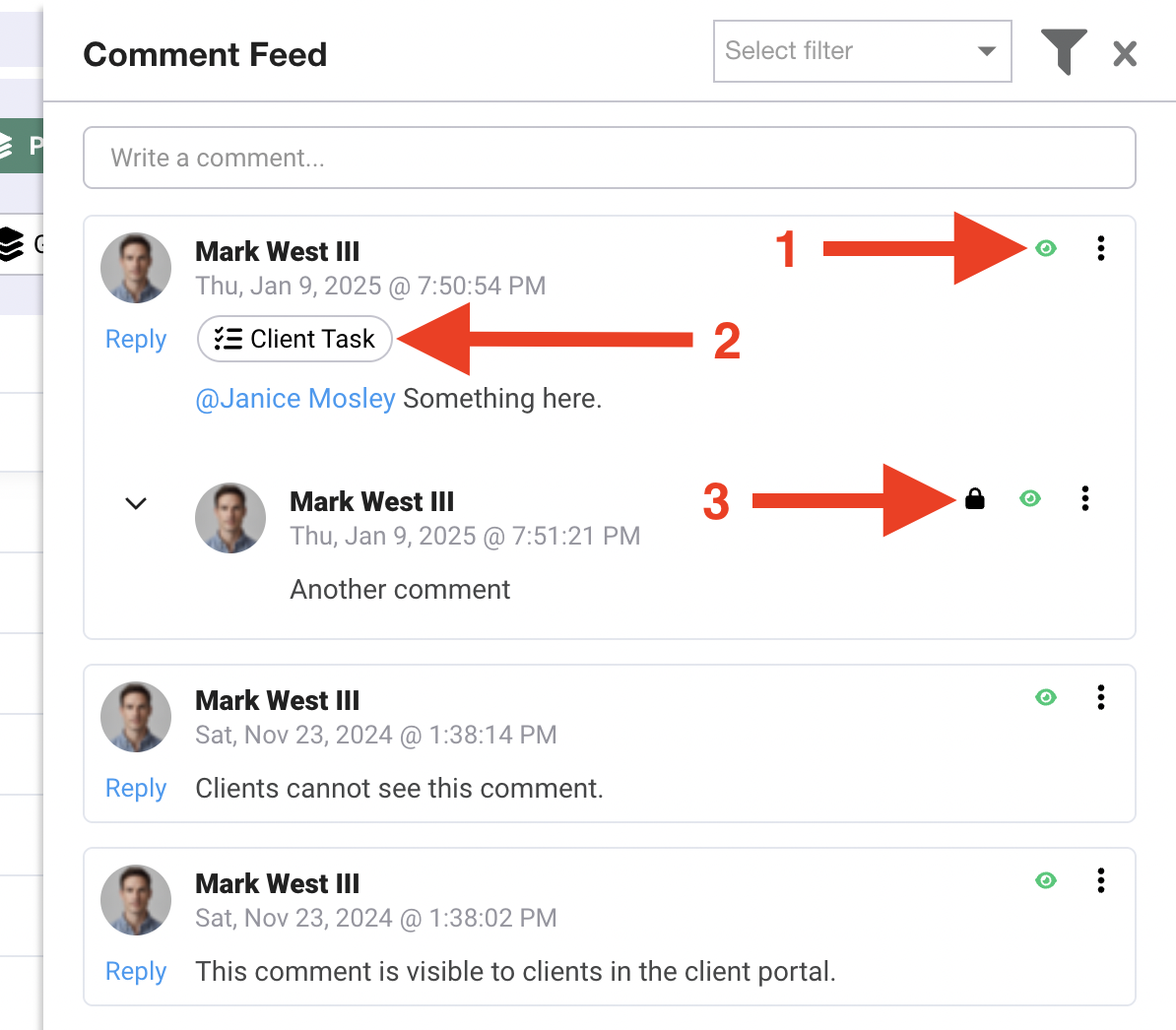 Filter by comments that are visible to clients who have access to a client portal.